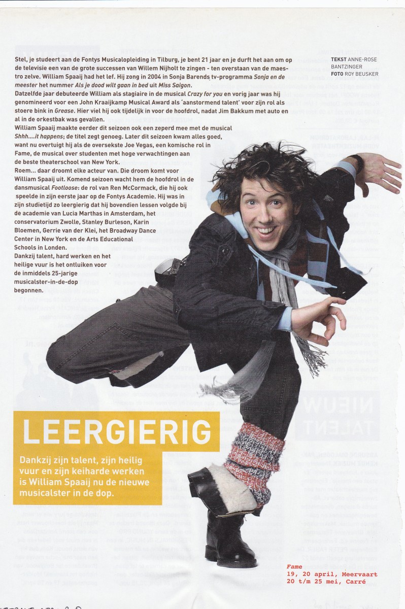 En trouwens, wat is William Spaaij goed! Ik denk tevreden terug aan het jaar 2008 – achttien jaar geleden! – toen ik hem in De Uitkrant belichtte op een hele pagina als ‘de nieuwe musicalster in de dop’: ‘Dankzij talent, hard werken en het heilige vuur is het ontluiken voor de inmiddels 25-jarige musicalster-in-de-dop begonnen’. Ik memoreerde destijds dat hij het lef had om vier jaar eerder als student aan de Fontys Musicalopleiding voor een tv-programma van Sonja Barend tegenover Willem Nijholt – de maestro zelve – het lied Als je dood wilt gaan in bed uit Miss Saigon te zingen. Een lied dat Nijholt in Miss Saigon zong. Nou, dan heb je ‘pezazz’… Bravo, William Spaaij!