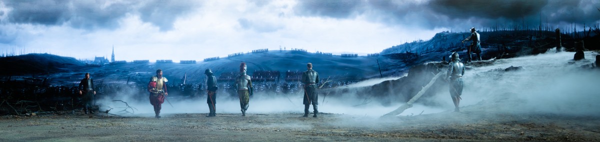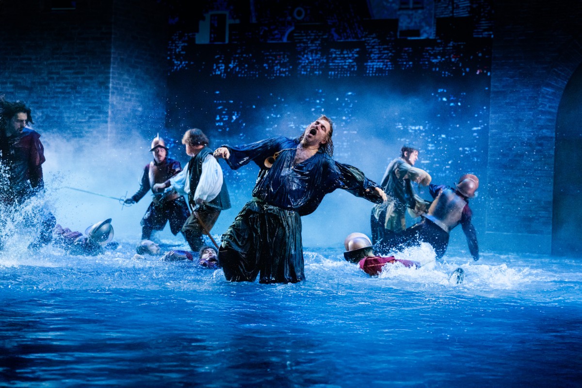 Deze zeeslag – ‘1 april 1572 verloor Alva zijn bril’ – wordt op beeldschermen overweldigend in beeld gebracht. Duizelingwekkend, bijna té groot. Hetzelfde geldt voor het einde van het beleg van Leiden, waarbij de mannen van Willem van Oranje de dijken doorbraken. Eerst komt de golven op beeldschermen links en rechts aangestormd en daarna loopt het toneel daadwerkelijk vol water. Daarin gaan de gevechten door en Lumey sneuvelt in het water. Daarbij is de chloorachtige zwembadlucht wel erg penetrant en de water-aan-het-strand-scènes in Soldaat zijn waarachtiger.