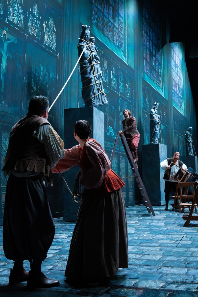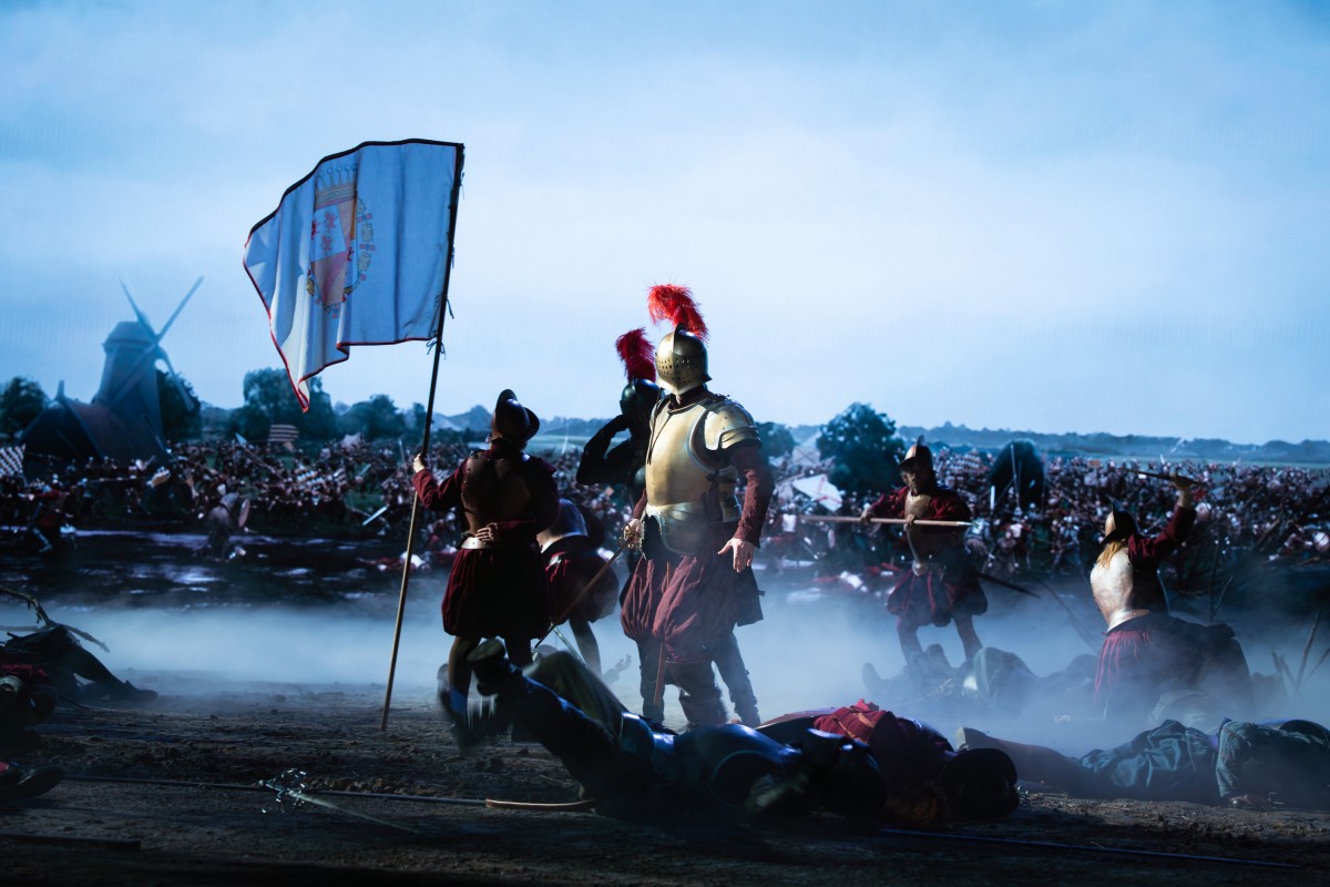 De scenografie en de special effects zijn dus werkelijk overrompelend. Je valt als toeschouwer van de ene verbazing in de andere. Het ene moment zie je een intieme scène in de werkruimte van Willem van Oranje en na enig geschuif van de panelen zie je een slagveld, een kathedraal, een dorpsplein met een brandstapel. Of een herberg, een slagveld of de overstroming die gepaard ging bij het ontzet van Leiden. En dan de filmbeelden! De ene keer gigantische groot dravende paarden, dan weer een heel leger dat oprukt en dan weer grote plattegronden om te illustreren waar de gevechten, de branden of andere narigheid zich afspelen.